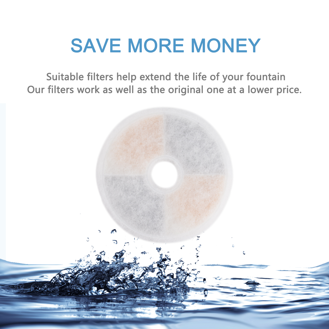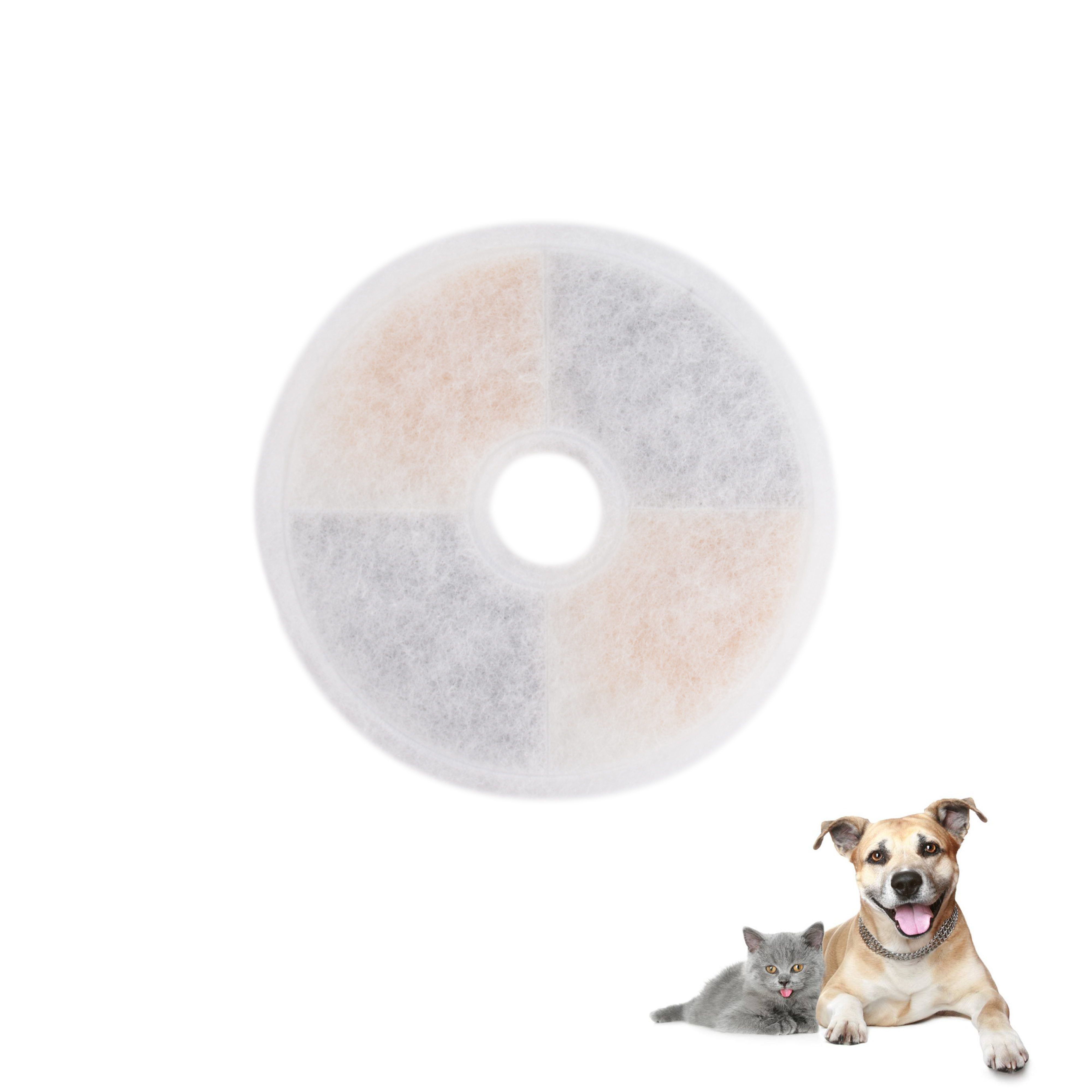 We use 100% coconut shell activated carbon as the material which can effectively remove over 90% free Chlorine residual, sediment, some organic compoundsodors and filter the bacteria in water to keep cleanness of filtered water which can encourage pets to drink more and get the proper hydration essential to their health.